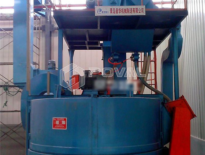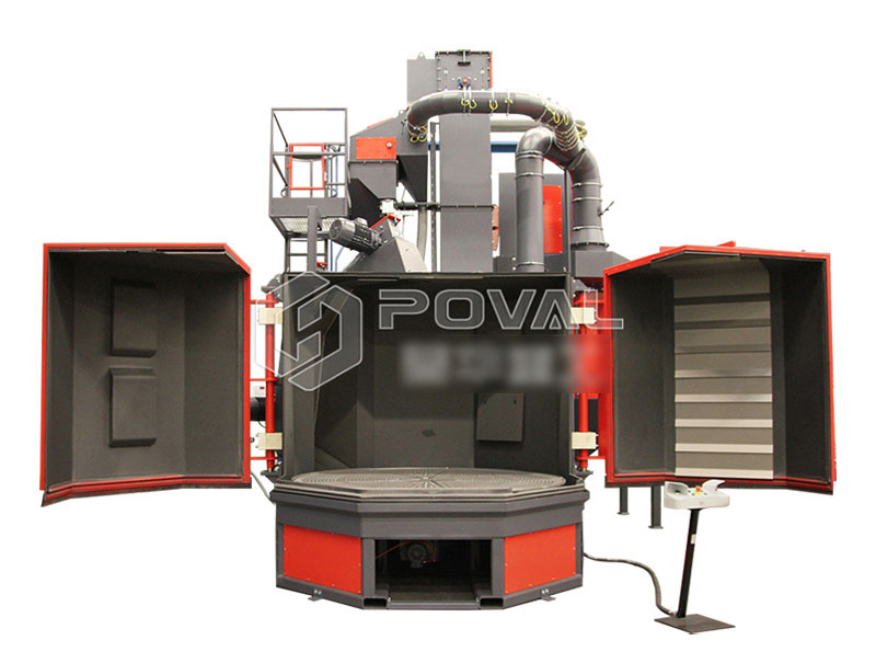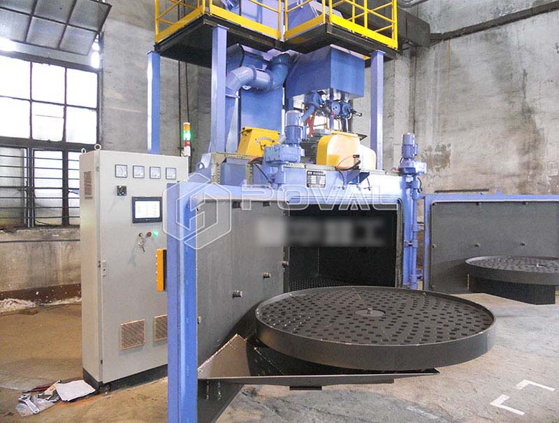 轉臺式拋丸機主要由室體、轉臺、傳動系統、分離器、提升機、輸丸裝置、拋丸器等部分組成,在室頂一臺高速旋轉的拋丸器,對工件進行全方位的拋射,工件隨著轉臺轉出室體時,可直接看到清理效果,以便進行下一步工作。