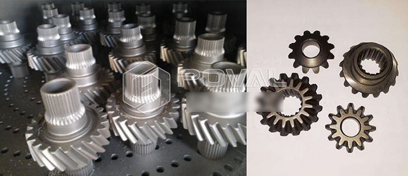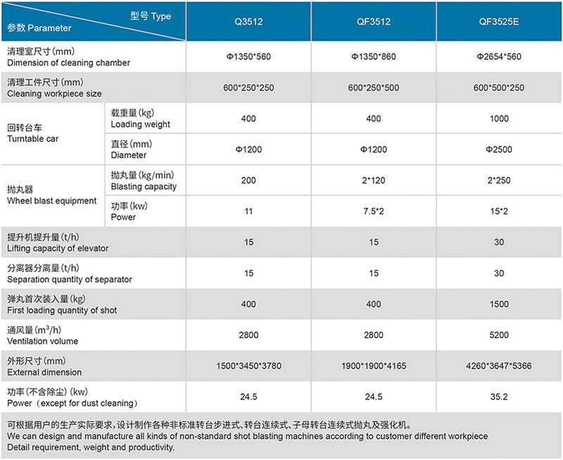 轉臺式強化、拋丸清理機于鑄鍛件及熱處理后的扁平、薄壁怕碰撞零件的表面清理,它可去除工件表面的粘砂、氧化皮等附著物,獲得一定粗糙度的光亮表面,亦可用來對某些齒輪、板簧件工件表面進行強化處理。