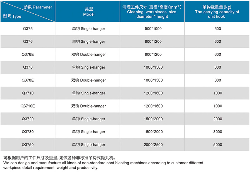 吊鉤式拋丸機主要適用于各種中、大型鑄件、鍛件、焊件、熱處理件的表面處理,包括易碎和形狀不規則的工件。吊鉤式拋丸清理機適合于鑄造、建筑、化工、電機、機床等行業的中、小型鑄、鍛件的表面清理或強化處理,特別適合于多品種、小批量的鑄件、鍛件及鋼結構件進行表面清理及拋丸強化,以去掉工件表面的少量粘砂、砂芯及氧化皮;亦適合于對熱處理件的表面清理及強化;尤其適合于不宜碰撞的細長、薄壁件的清理。