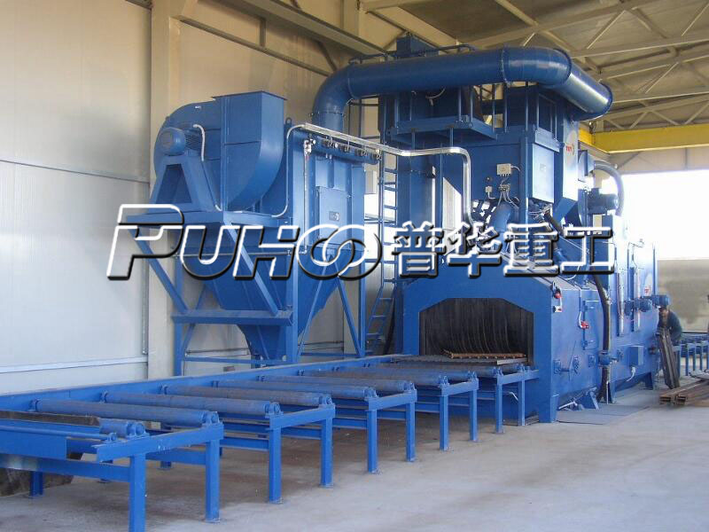 本機(jī)主要功能部件是清理室,室內(nèi)輸送輥道與進(jìn)出料輸送輥道、拋丸器、彈丸循環(huán)系統(tǒng)(含提升機(jī)、分離器、縱橫螺旋輸送器及彈丸回收機(jī)構(gòu)和供丸管道)吹掃機(jī)構(gòu)、除塵、電氣控制等部件組成。